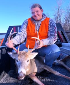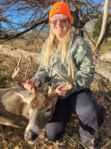 Courtney Hollenbeck proudly displays her first deer, this nice 4×4 whitetail buck.