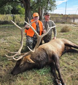 Robert Allpress of Naper (in orange) was fortunate enough to harvest this huge bull elk Oct. 13 in the Niobrara River valley in Keya Paha County.